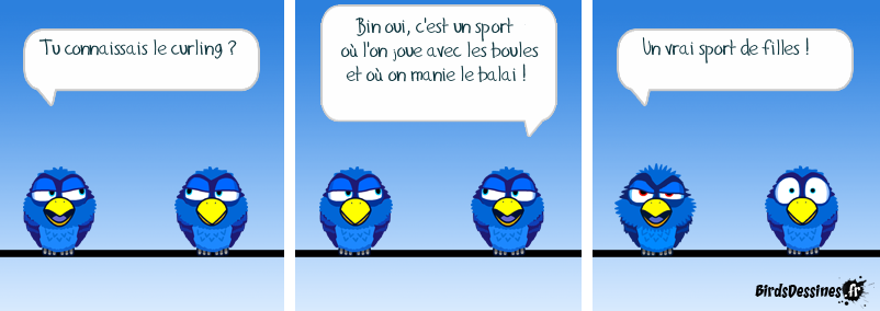 Case 1:Bird 1: Tu connaissais le curling ? Case 2:Bird 1: Bin oui, c'est un sport où l'on joue avec les boules et où on manie le balai ! Case 3:Bird 1: Un vrai sport de filles !