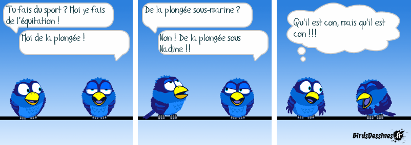 Case 1:Bird 1: Tu fais du sport ? Moi je fais de l’équitation !Bird 2: Moi de la plongée ! Case 2:Bird 1: De la plongée sous-marine ?Bird 2: Non ! De la plongée sous Nadine !! Case 3:Bird 1: Qu'il est con, mais qu'il est con !!!