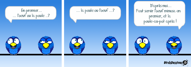 Case 1:Bird 1: En premier... ... l'oeuf ou la poule ..? Case 2:Bird 1: ... la poule ou l'oeuf ...? Case 3:Bird 1: D'après moi... Faut servir l'oeuf mimosa en premier, et la poule-au-pot après !