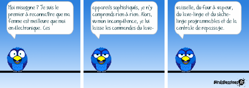 Case 1:Bird 1: Moi misogyne ? Je suis le premier à reconnaïtre que ma femme est meilleure que moi en électronique. Ces Case 2:Bird 1: appareils sophistiqués, je n'y comprends rien à rien. Alors, vu mon incompétence, je lui laisse les commandes du lave- Case 3:Bird 1: vaisselle, du four à vapeur, du lave-linge et du sèche-linge programmables et de la centrale de repassage.