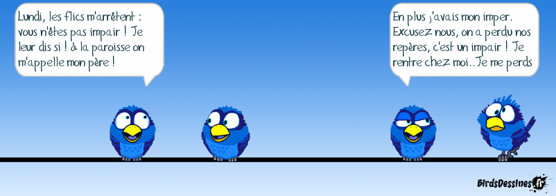 Case 1:Bird 1: Lundi, les flics m'arrêtent : vous n'êtes pas impair ! Je leur dis si ! à la paroisse on m'appelle mon père ! Case 2: Case 3:Bird 1: En plus j'avais mon imper. Excusez nous, on a perdu nos repères, c'est un impair ! Je rentre chez moi..Je me perds