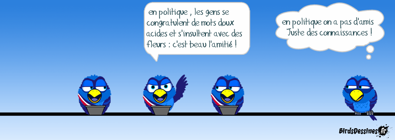 Case 1: Case 2:Bird 1: en politique , les gens se congratulent de mots doux acides et s'insultent avec des fleurs : c'est beau l'amitié ! Case 3:Bird 1: en politique on a pas d'amis Juste des connaissances !