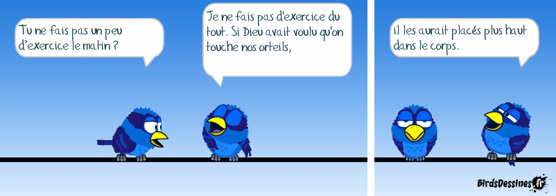 Case 1:Bird 1: Tu ne fais pas un peu d’exercice le matin ? Case 2:Bird 1: Je ne fais pas d'exercice du tout. Si Dieu avait voulu qu'on touche nos orteils, Case 3:Bird 1: il les aurait placés plus haut dans le corps.