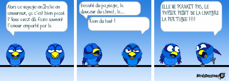Case 1:Bird 1: Alors ce voyage en Italie en amoureux, ça c’est bien passé ? Vous avez dû faire souvent l’amour emporté par la Case 2:Bird 1: beauté du paysage, la douceur du climat, la….Bird 2: Rien du tout ! Case 3:Bird 1: ELLE NE POUVAIT PAS, LE PAPIER PEINT DE LA CHAMBRE LA PERTUBEE !!!!