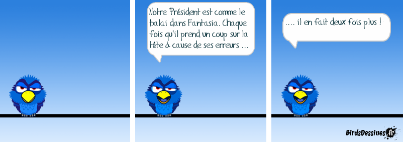 Case 1: Case 2:Bird 1: Notre Président est comme le balai dans Fantasia. Chaque fois qu'il prend un coup sur la tête à cause de ses erreurs ... Case 3:Bird 1: .... il en fait deux fois plus !