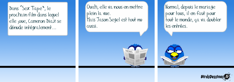 Case 1:Bird 1: Dans «Sex Tape», le prochain film dans lequel elle joue, Cameron Diaz se dénude intégralement... Case 2:Bird 1: Ouah, elle va nous en mettre plein la vue. Mais Jason Segel est tout nu aussi. Case 3:Bird 1: Normal, depuis le mariage pour tous, il en faut pour tout le monde, ça va doubler les entrées.