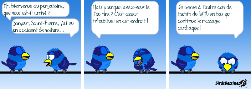 Case 1:Bird 1: Mr, bienvenue au purgatoire, que vous est-il arrivé ?Bird 2: Bonjour, Saint-Pierre, j'ai eu un accident de voiture... Case 2:Bird 1: Mais pourquoi avez-vous le fou rire ? C'est assez inhabituel en cet endroit ! Case 3:Bird 1: Je pense à l'autre con de toubib du SAMU en bas qui continue le massage cardiaque !
