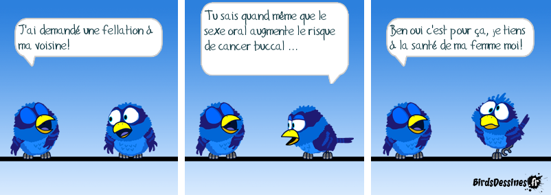 Case 1:Bird 1: J'ai demandé une fellation à ma voisine! Case 2:Bird 1: Tu sais quand même que le sexe oral augmente le risque de cancer buccal ... Case 3:Bird 1: Ben oui c'est pour ça, je tiens à la santé de ma femme moi!