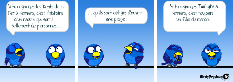 Case 1:Bird 1: Si tu regardes les Dents de la Mer à l'envers, c'est l'histoire d'un requin qui vomit tellement de personnes... Case 2:Bird 1: ... qu'ils sont obligés d'ouvrir une plage ! Case 3:Bird 1: Si tu regardes Twilight à l'envers, c'est toujours un film de merde.