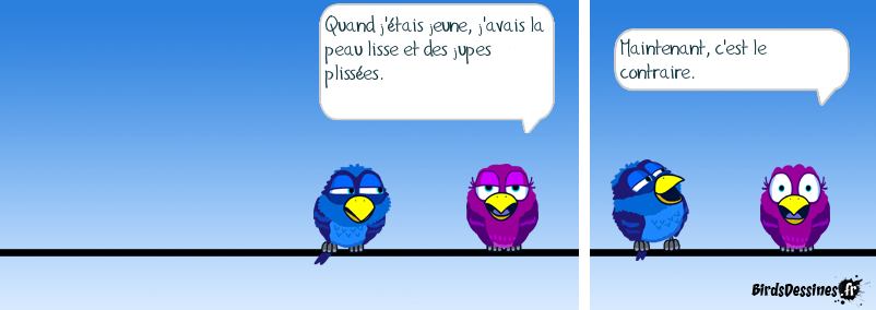 Case 1: Case 2:Bird 1: Quand j'étais jeune, j'avais la peau lisse et des jupes plissées. Case 3:Bird 1: Maintenant, c'est le contraire.