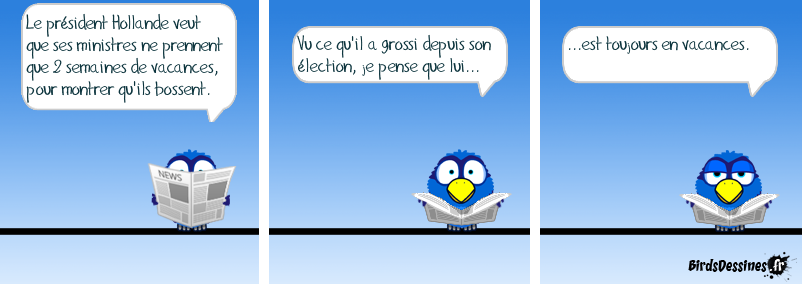 Case 1:Bird 1: Le président Hollande veut que ses ministres ne prennent que 2 semaines de vacances, pour montrer qu'ils bossent. Case 2:Bird 1: Vu ce qu'il a grossi depuis son élection, je pense que lui... Case 3:Bird 1: ...est toujours en vacances.