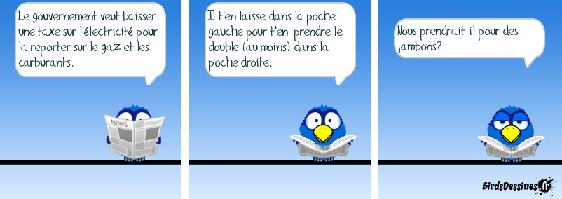 Case 1:Bird 1: Le gouvernement veut baisser une taxe sur l'électricité pour la reporter sur le gaz et les carburants. Case 2:Bird 1: Il t'en laisse dans la poche gauche pour t'en prendre le double (au moins) dans la poche droite. Case 3:Bird 1: Nous prendrait-il pour des jambons?