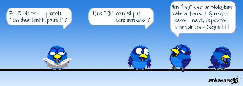 Case 1:Bird 1: En 13 lettres : (pluriel) " Les deux font la paire !" ? Case 2:Bird 1: Mais "MB", ce n'est pas dans mon dico ? Case 3:Bird 1: Non "heg'" c'est un néologisme côté en bourse ! Quand ils l'auront trouvé, ils pourront aller voir chez Google ! ! !