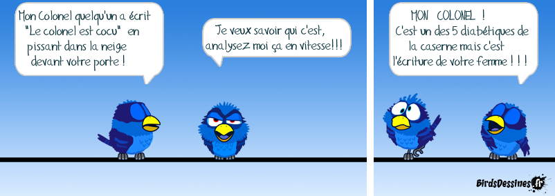 Case 1:Bird 1: Mon Colonel quelqu'un a écrit "Le colonel est cocu" en pissant dans la neige devant votre porte ! Case 2:Bird 1: Je veux savoir qui c'est, analysez moi ça en vitesse!!! Case 3:Bird 1: MON COLONEL ! C'est un des 5 diabétiques de la caserne mais c'est l'écriture de votre femme ! ! !