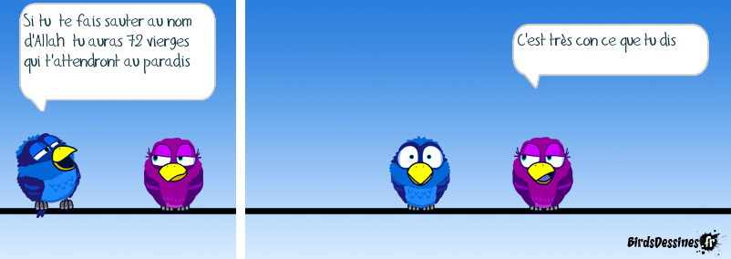 Case 1:Bird 1: Si tu te fais sauter au nom d'Allah tu auras 72 vierges qui t'attendront au paradis Case 2: Case 3:Bird 1: C'est très con ce que tu dis