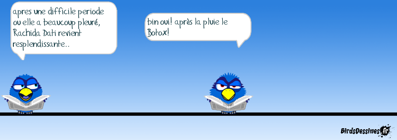 Case 1:Bird 1: apres une difficile periode ou elle a beaucoup pleuré, Rachida Dati revient resplendissante.. Case 2:Bird 1: bin oui! après la pluie le Botox! Case 3: