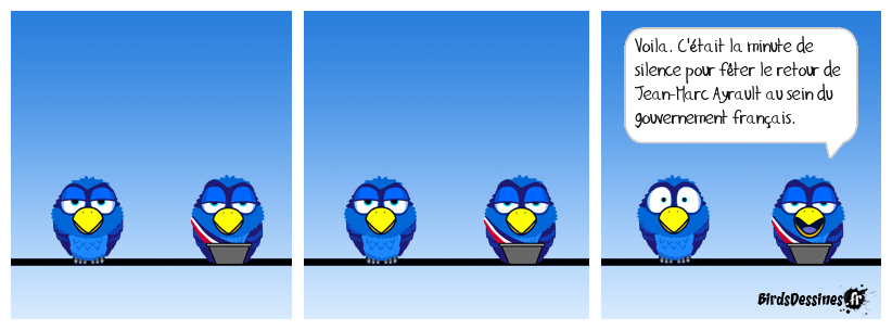 Case 1: | Case 2: | Case 3: Bird 1: Voila. C'était la minute de silence pour fêter le retour de Jean-Marc Ayrault au sein du gouvernement français.