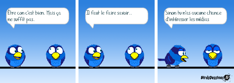 Case 1:Bird 1: Être con c'est bien. Mais ça ne suffit pas. Case 2:Bird 1: Il faut le faire savoir.. Case 3:Bird 1: Sinon tu n'as aucune chance d'intéresser les médias