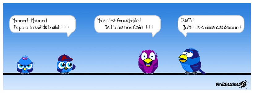 Case 1:Bird 1: Maman ! Maman l Papa a trouvé du boulot ! ! ! | Case 2: Bird 1: Mais c'est formidable ! Je t'aime mon Chéri ! ! ! | Case 3: Bird 1: OUAIS ! Bah ! tu commences demain !