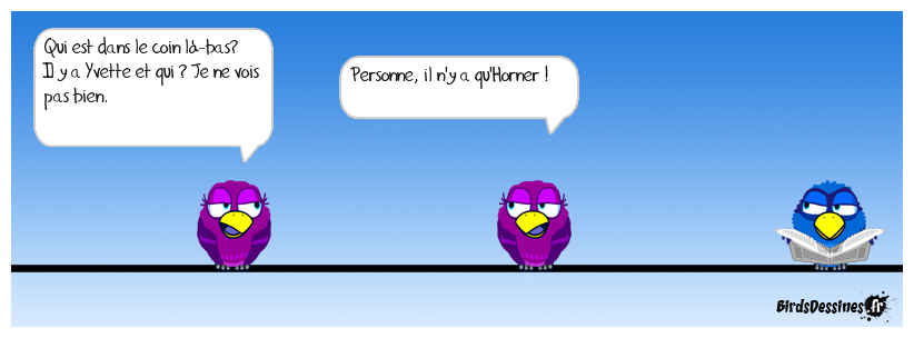 Case 1:Bird 1: Qui est dans le coin là-bas? Il y a Yvette et qui ? Je ne vois pas bien. | Case 2: Bird 1: Personne, il n'y a qu'Horner ! | Case 3: