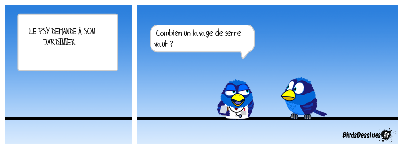 Case 1:Bird 1: LE PSY DEMANDE À SON JARDINIER | Case 2: Bird 1: Combien un lavage de serre vaut ? | Case 3: