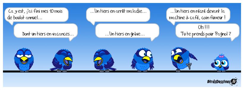 Case 1:Bird 1: Ca y est, j'ai fini mes 10 mois de boulot annuel... Bird 2: Dont un tiers en vacances... | Case 2: Bird 1: ...Un tiers en arrêt maladie... Bird 2: ...Un tiers en grève... | Case 3: Bird 1: ...Un tiers en récré devant la machine à café, coin fumeur ! Bird 2: Oh !!! Tu te prends pour Pagnol ?