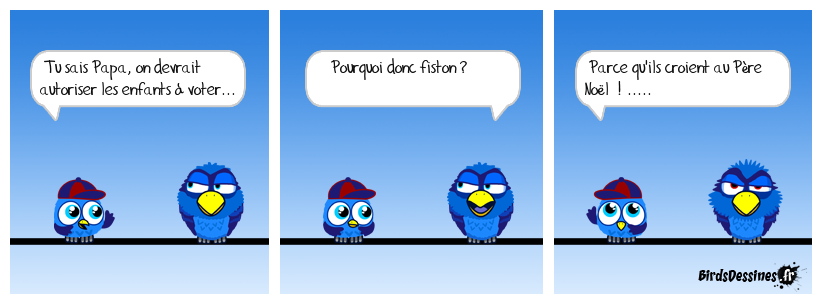 Case 1:Bird 1: Tu sais Papa, on devrait autoriser les enfants à voter... | Case 2: Bird 1: Pourquoi donc fiston ? | Case 3: Bird 1: Parce qu'ils croient au Père Noël ! .....