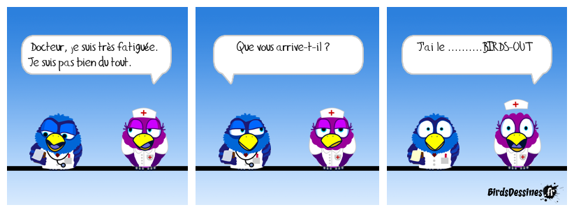 Case 1:Bird 1: Docteur, je suis très fatiguée. Je suis pas bien du tout. | Case 2: Bird 1: Que vous arrive-t-il ? | Case 3: Bird 1: J'ai le ..........BIRDS-OUT