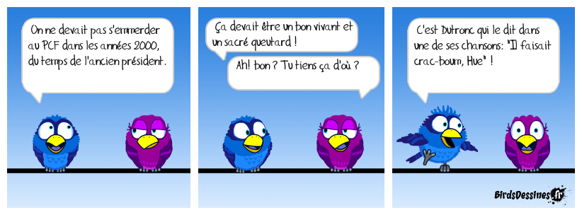 Case 1:Bird 1: On ne devait pas s'emmerder au PCF dans les années 2000, du temps de l'ancien président. | Case 2: Bird 1: Ça devait être un bon vivant et un sacré queutard ! Bird 2: Ah! bon ? Tu tiens ça d'où ? | Case 3: Bird 1: C'est Dutronc qui le dit dans une de ses chansons: "Il faisait crac-boum, Hue" !