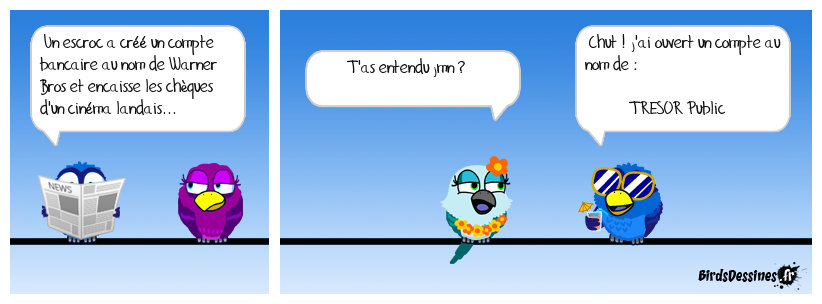 Case 1:Bird 1: Un escroc a créé un compte bancaire au nom de Warner Bros et encaisse les chèques d'un cinéma landais... | Case 2: Bird 1: T'as entendu jmn ? | Case 3: Bird 1: Chut ! j'ai ouvert un compte au nom de : TRESOR Public