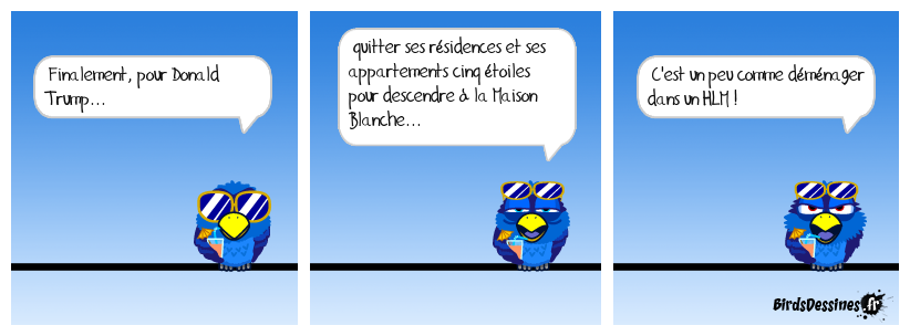 Case 1:Bird 1: Finalement, pour Donald Trump... | Case 2: Bird 1: quitter ses résidences et ses appartements cinq étoiles pour descendre à la Maison Blanche... | Case 3: Bird 1: C'est un peu comme déménager dans un HLM !