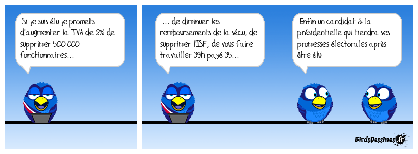 Case 1:Bird 1: Si je suis élu je promets d'augmenter la TVA de 2% de supprimer 500 000 fonctionnaires... | Case 2: Bird 1: ... de diminuer les remboursements de la sécu, de supprimer l'ISF, de vous faire travailler 39h payé 35... | Case 3: Bird 1: Enfin un candidat à la présidentielle qui tiendra ses promesses électorales après être élu