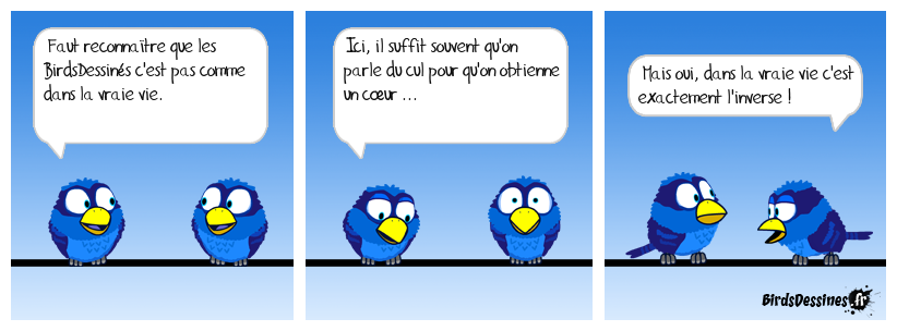 Case 1:Bird 1: Faut reconnaître que les BirdsDessinés c'est pas comme dans la vraie vie. | Case 2: Bird 1: Ici, il suffit souvent qu'on parle du cul pour qu'on obtienne un cœur ... | Case 3: Bird 1: Mais oui, dans la vraie vie c'est exactement l'inverse !