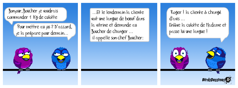 Case 1:Bird 1: Bonjour,Boucher je voudrais commander 1 Kg de culotteBird 2: Pour mettre au jus ? D’accord, je la prépare pour demain... | Case 2: Bird 1: ...Et le lendemain la cliente voit une langue de bœuf dans la vitrine et demande au Boucher de changer ... il appelle son chef Boucher: | Case 3: Bird 1: Roger ! la cliente à changé d'avis ... Enlève la culotte de Madame et passe lui une langue !