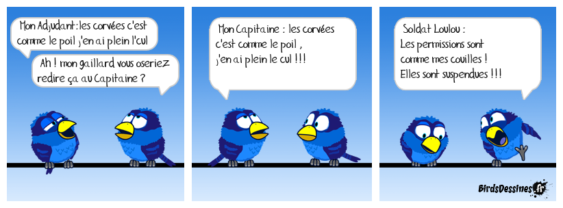 Case 1:Bird 1: Mon Adjudant:les corvées c'est comme le poil j'en ai plein l'culBird 2: Ah ! mon gaillard vous oseriez redire ça au Capitaine ? | Case 2: Bird 1: Mon Capitaine : les corvées c'est comme le poil , j'en ai plein le cul !!! | Case 3: Bird 1: Soldat Loulou : Les permissions sont comme mes couilles ! Elles sont suspendues !!!