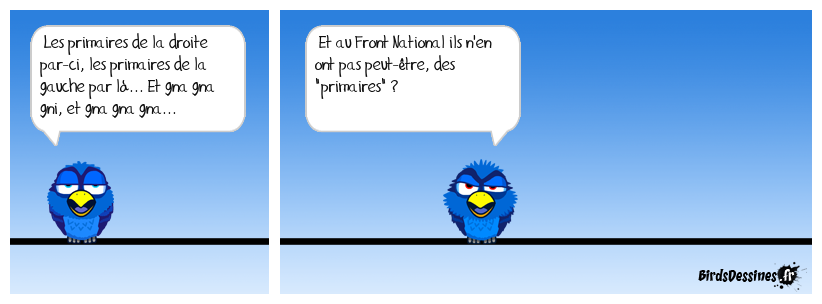 Case 1:Bird 1: Les primaires de la droite par-ci, les primaires de la gauche par là... Et gna gna gni, et gna gna gna... | Case 2: Bird 1: Et au Front National ils n'en ont pas peut-être, des "primaires" ? | Case 3: