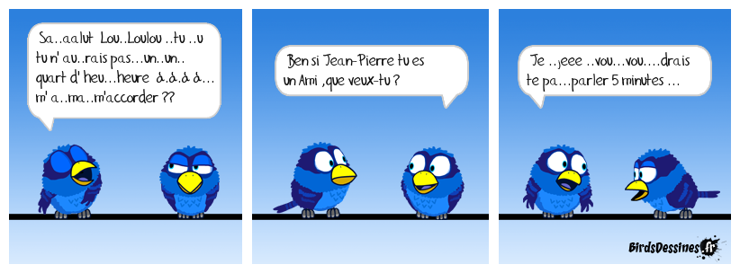Case 1:Bird 1: Sa..aalut Lou..Loulou ..tu ..u tu n' au..rais pas...un..un.. quart d' heu...heure à.à.à à... m' a..ma..m'accorder ?? | Case 2: Bird 1: Ben si Jean-Pierre tu es un Ami ,que veux-tu ? | Case 3: Bird 1: Je ..jeee ..vou...vou....drais te pa...parler 5 minutes ...