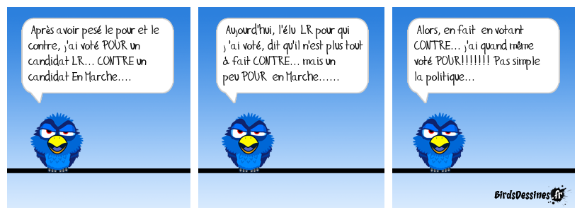 Case 1:Bird 1: Après avoir pesé le pour et le contre, j'ai voté POUR un candidat LR... CONTRE un candidat En Marche.... | Case 2: Bird 1: Aujourd'hui, l'élu LR pour qui j 'ai voté, dit qu'il n'est plus tout à fait CONTRE... mais un peu POUR en Marche...... | Case 3: Bird 1: Alors, en fait en votant CONTRE... j'ai quand même voté POUR!!!!!!! Pas simple la politique...