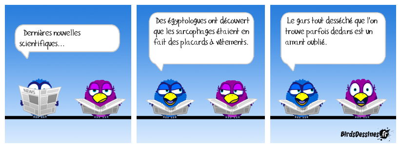 Case 1:Bird 1: Dernières nouvelles scientifiques... | Case 2: Bird 1: Des égyptologues ont découvert que les sarcophages étaient en fait des placards à vêtements. | Case 3: Bird 1: Le gars tout desséché que l'on trouve parfois dedans est un amant oublié.