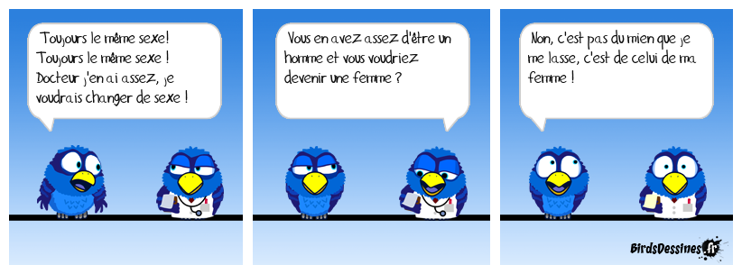 Case 1:Bird 1: Toujours le même sexe! Toujours le même sexe ! Docteur j'en ai assez, je voudrais changer de sexe ! | Case 2: Bird 1: Vous en avez assez d'être un homme et vous voudriez devenir une femme ? | Case 3: Bird 1: Non, c'est pas du mien que je me lasse, c'est de celui de ma femme !