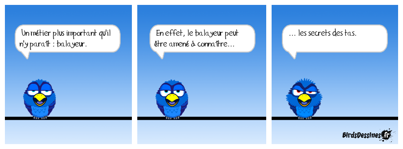 Case 1:Bird 1: Un métier plus important qu'il n'y paraït : balayeur. | Case 2: Bird 1: En effet, le balayeur peut être amené à connaïtre... | Case 3: Bird 1: ... les secrets des tas.