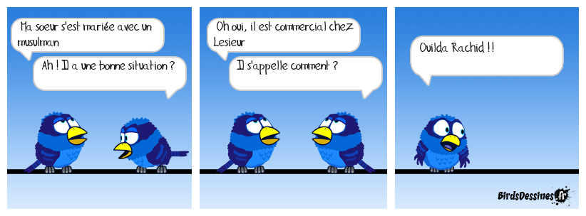 Case 1:Bird 1: Ma soeur s'est mariée avec un musulmanBird 2: Ah ! Il a une bonne situation ? | Case 2: Bird 1: Oh oui, il est commercial chez Lesieur Bird 2: Il s'appelle comment ? | Case 3: Bird 1: Ouilda Rachid !!