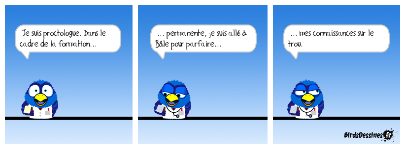 Case 1:Bird 1: Je suis proctologue. Dans le cadre de la formation... | Case 2: Bird 1: ... permanente, je suis allé à Bâle pour parfaire... | Case 3: Bird 1: ... mes connaissances sur le trou.
