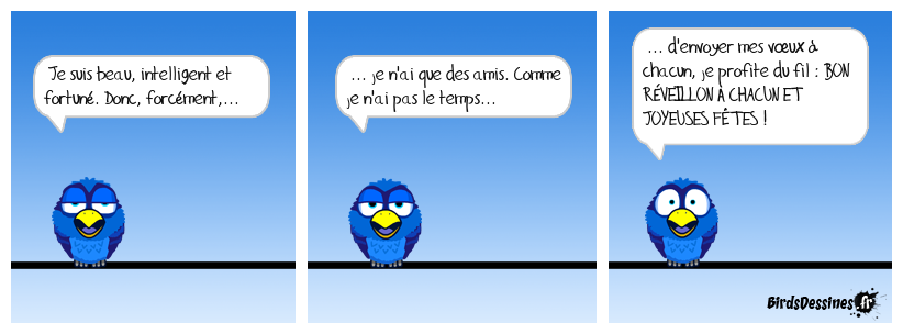 Case 1:Bird 1: Je suis beau, intelligent et fortuné. Donc, forcément,... | Case 2: Bird 1: ... je n'ai que des amis. Comme je n'ai pas le temps... | Case 3: Bird 1: ... d'envoyer mes vœux à chacun, je profite du fil : BON RÈVEILLON À CHACUN ET JOYEUSES FÊTES !