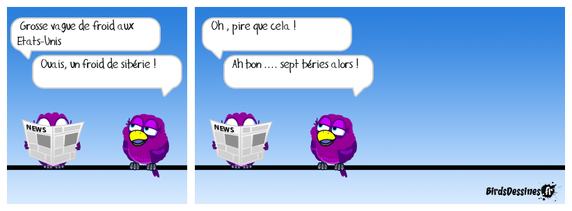 Case 1:Bird 1: Grosse vague de froid aux Etats-UnisBird 2: Ouais, un froid de sibérie ! | Case 2: Bird 1: Oh , pire que cela ! Bird 2: Ah bon .... sept béries alors ! | Case 3:
