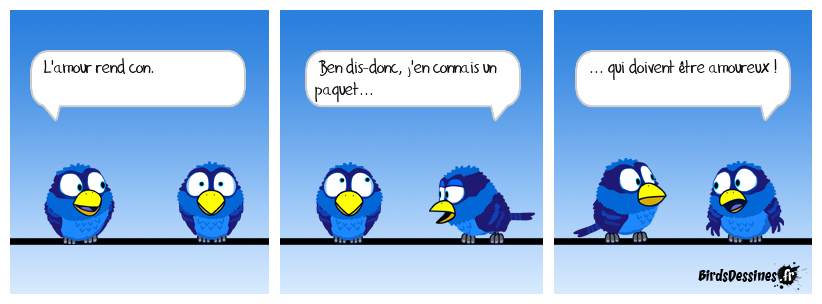 Case 1:Bird 1: L'amour rend con. | Case 2: Bird 1: Ben dis-donc, j'en connais un paquet... | Case 3: Bird 1: ... qui doivent être amoureux !
