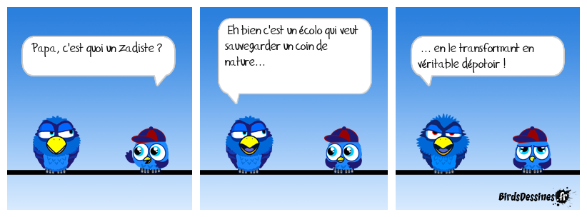 Case 1:Bird 1: Papa, c'est quoi un zadiste ? | Case 2: Bird 1: Eh bien c'est un écolo qui veut sauvegarder un coin de nature... | Case 3: Bird 1: ... en le transformant en véritable dépotoir !
