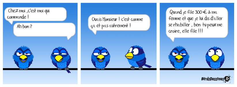 Case 1:Bird 1: Chez moi ,c'est moi qui commande !Bird 2: Ah bon ? | Case 2: Bird 1: Ouais Monsieur ! c'est comme ça et pas autrement ! | Case 3: Bird 1: Quand je file 300 € à ma femme et que je lui dis d'aller se rhabiller , ben tu peux me croire, elle file !!!