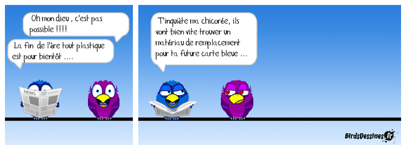 Case 1:Bird 1: Oh mon dieu , c'est pas possible !!!!Bird 2: La fin de l'ère tout plastique est pour bientôt .... | Case 2: Bird 1: T'inquiète ma chicorée, ils vont bien vite trouver un matériau de remplacement pour ta future carte bleue ... | Case 3: