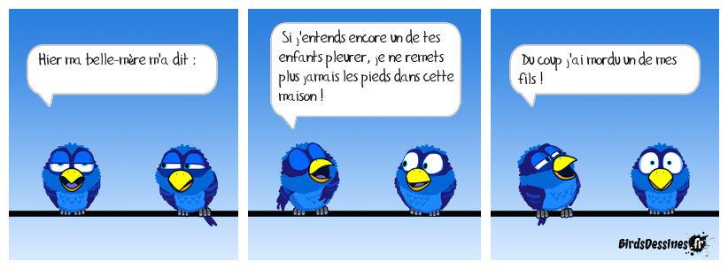 Case 1:Bird 1: Hier ma belle-mère m'a dit : | Case 2: Bird 1: Si j'entends encore un de tes enfants pleurer, je ne remets plus jamais les pieds dans cette maison ! | Case 3: Bird 1: Du coup j'ai mordu un de mes fils !